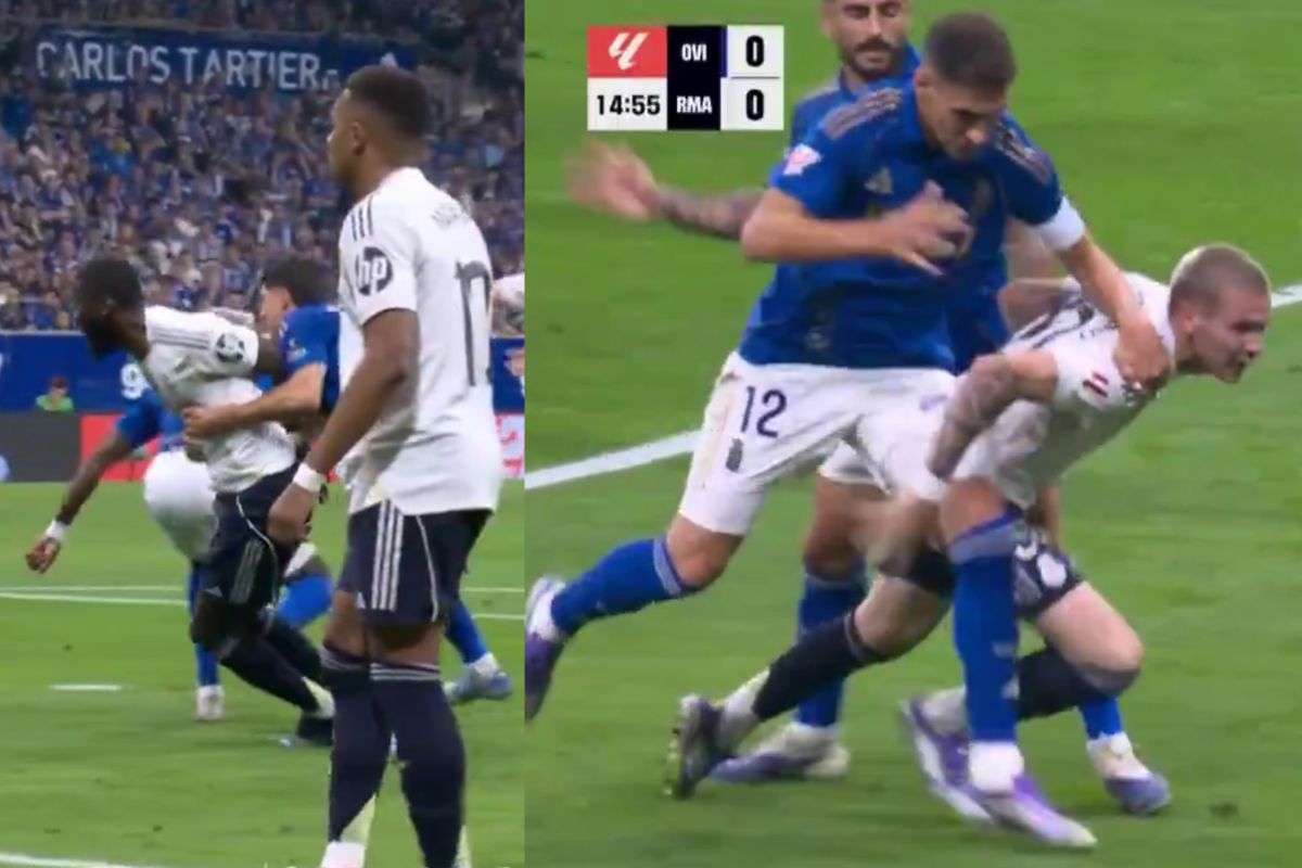 En la segunda acción polémica fue por otro agarrón, esta vez a Franco Mastantuono, que desquiciaba a los madridistas. En el minuto 15′ Bengoetxea ya se confirmaba como el protagonista del encuentro dejando en nada dos grandes agarrones en el área de ataque.