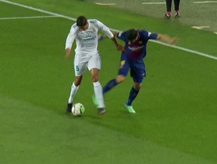 En la temporada 2017-2018, una jugada idéntica a la de ayer en el Reale Arena le costó perder la liga al Real Madrid. Sucedió en el clásico en el Camp Nou ante el Barça. Luis Suárez hizo falta a Raphaël Varane y el colegiado no señaló nada, y la jugada acabó en gol del Barça, lo que sentenció la liga a favor del equipo azulgrana.