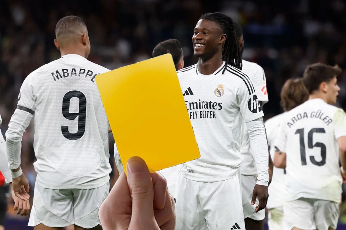 Jugadores del Real Madrid y una cartulina amarilla delante