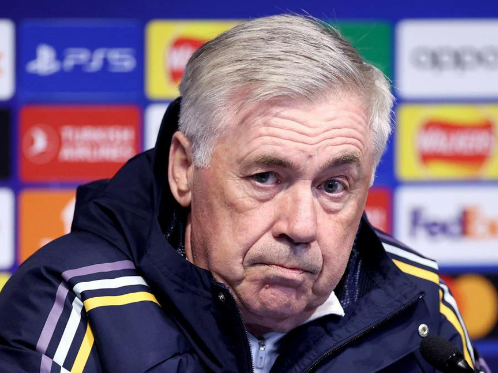 Carlo Ancelotti atiende a los medios de comunicación desde la sala de prensa del Etihad Stadium antes del Manchester City-Real Madrid.