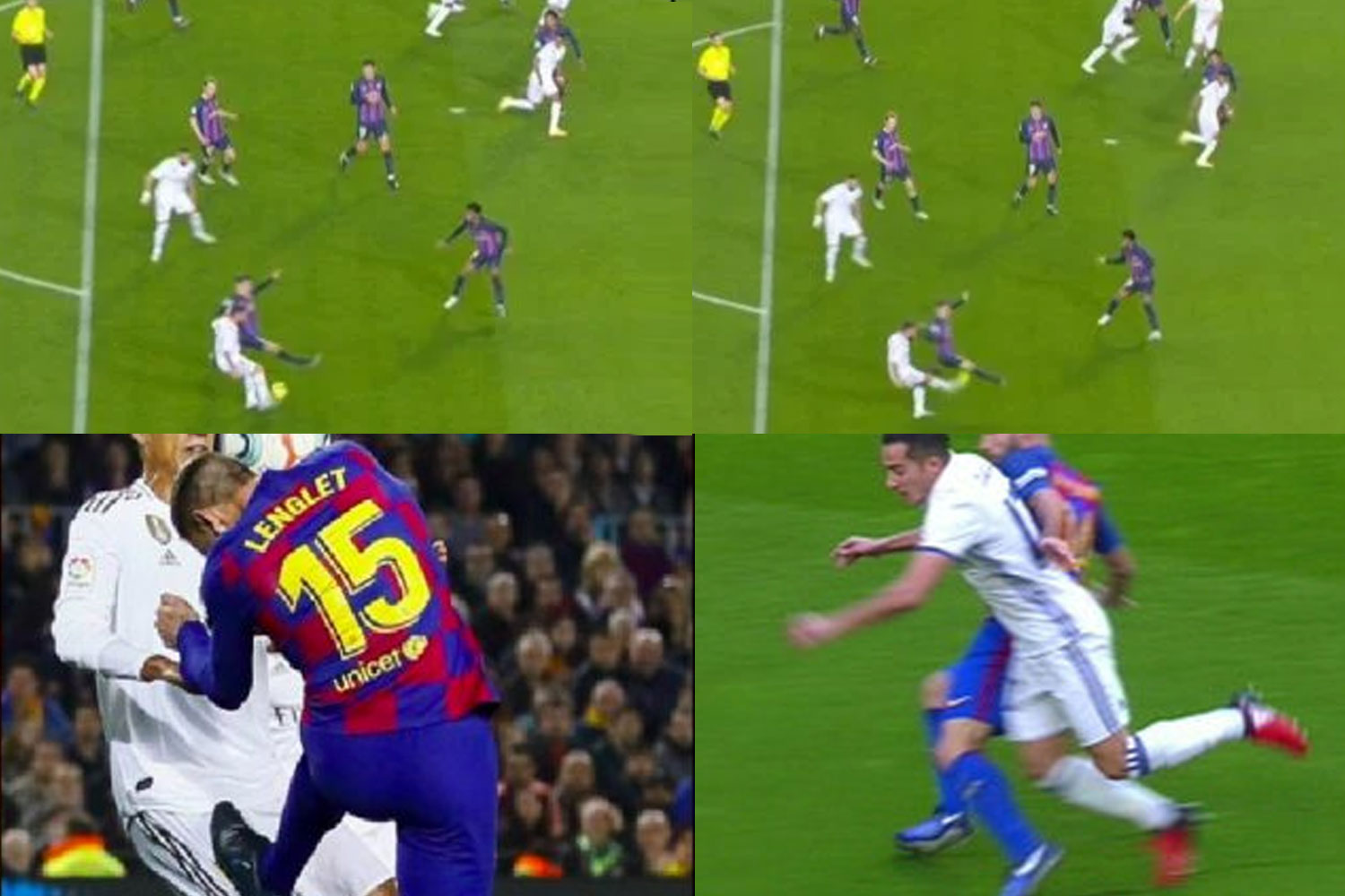 El Camp Nou fue testigo de uno de los Clásicos más escandalosos de la historia. El árbitro ignoró tres penaltis claros a favor del Madrid y anuló un gol de Bale por un fuera de juego inexistente. Al principio del partido, en un córner, Mascherano agarra de la camiseta a Cristiano Ronaldo, impidiendo que salte para rematar. En otro córner, Lenglet agarra repetidamente de la camiseta a Varane hasta derribarlo, pero el árbitro no señaló nada. En otro córner, Lenglet golpeó a Varane con una patada que dejó marcas en la pierna, pero nuevamente no se pitó nada. Y para culminar, anuló un gol a Bale por un fuera de juego que se demostró que no existía.