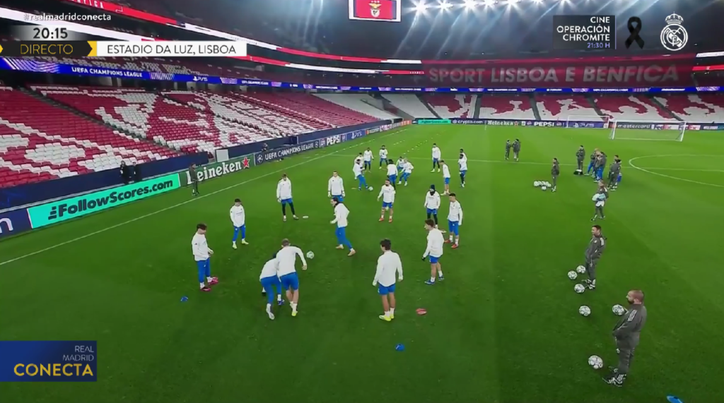 El Real Madrid se ejercitó en el recinto del encuentro, a buena temperatura y sin lluvia, con todos los futbolistas convocados que viajaron a Lisboa. Una sesión distendida que arrancó con muy buen ambiente y que también tuvo una pequeña charla técnica del míster salmantino.