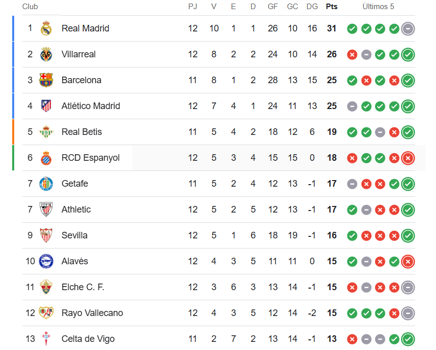 En tercera posición se queda el Villarreal con 26 puntos, mientras que el Atlético de Madrid cierra el TOP-4 por encima del Real Betis y del RCD Espanyol con un total de 25 puntos.