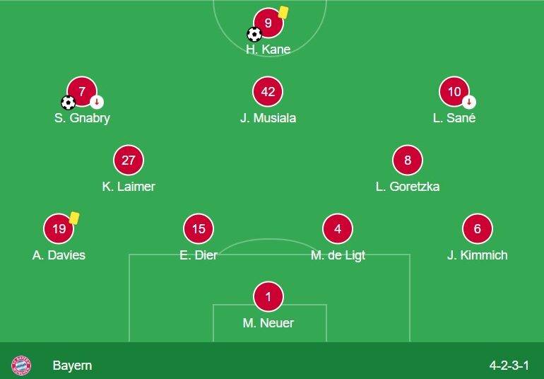 Si se recuperan los dos, este podría ser el once del Bayern: Neuer, Kimmich, De Ligt, Upamecano, Davies, Goretzka, Laimer, Gnabry, Musiala, Sané, Kane. Conociendo al equipo alemán, seguro que recuperan tanto a Gnabry como a Sané por pura estrategia.