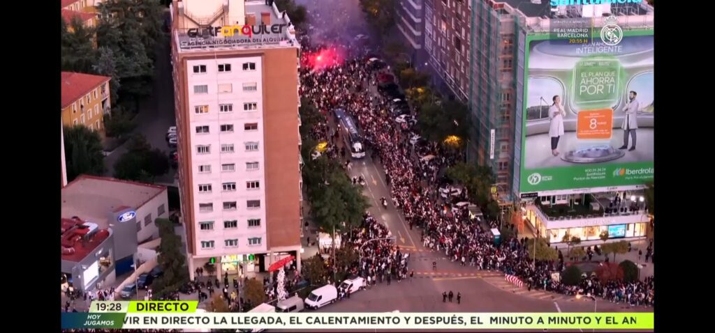 Miles de seguidores se congregaron para animar a su equipo, creando una atmósfera vibrante. Con cánticos y banderas alzadas, los madridistas dieron la bienvenida a los jugadores, que, al asomarse por las ventanas del autobús, se encontraron con una marea de apoyo incondicional.