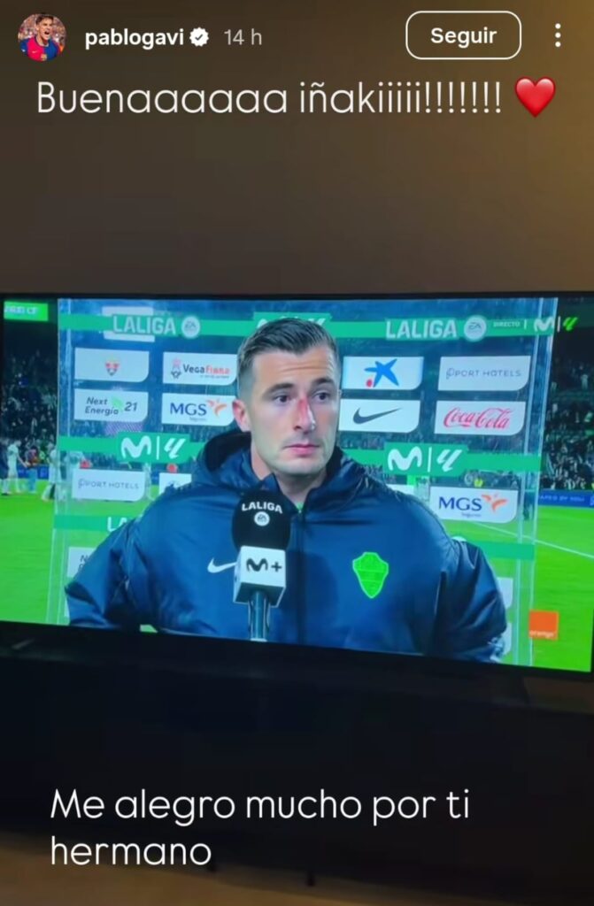 Ayer, por el 2-2, subió una imagen de Iñaki Peña siendo entrevistado tras el encuentro y puso otro mensaje en clave antimadridista: «Buena Iñaki, me alegro mucho por ti, hermano», apuntó