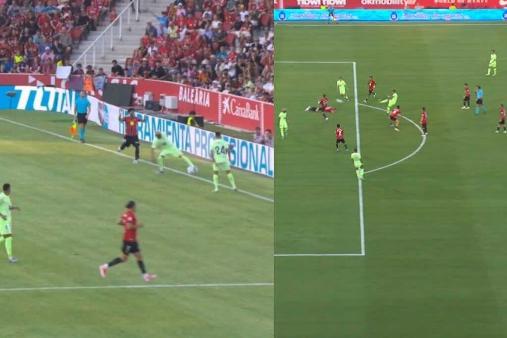 El 0-1 llegó con un centro lateral de Lamine Yamal a Raphinha que permitía rematar muy cómodo al brasileño. No había fuera de juego – y en eso se centró la realización del partido – pero sí que hubo un error de bulto que no se corrigió desde la sala VOR. La pelota, previamente, salió del campo y por tanto un saque de banda muy evidente terminó con el primer gol del FC Barcelona en Liga.