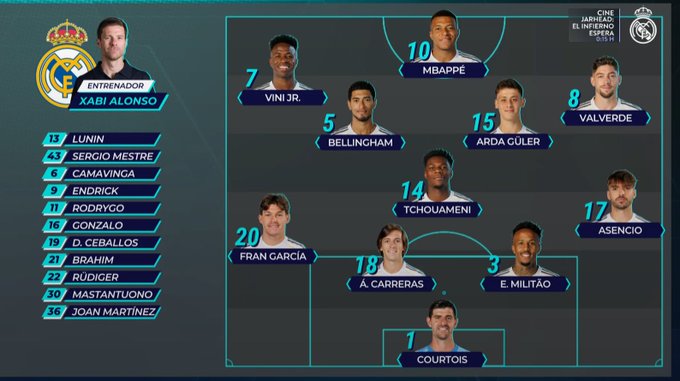Courtois, Asencio, Militao, Carreras, Fran García, Tchouaméni, Arda Güler, Bellingham, Valverde, Vinicius y Mbappé fueron los once elegidos por el míster de Tolosa para afrontar la nueva jornada liguera en el Santiago Bernabéu.