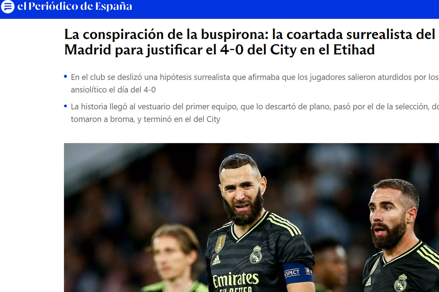 El Periódico de España cae en el bulo que corrió por las redes sociales después del partido de vuelta de las semifinales de la temporada pasada en el Etihad, donde el Real Madrid perdió 4-0. En los primeros minutos, el Madrid ya iba perdiendo por 2-0, y el City estaba pasando por encima del equipo blanco, que parecía que los jugadores del Madrid no podían con su alma.