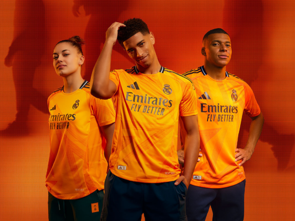 Mbappé aparece junto a Bellingham, Vinícius y Valverde, entre otros, en la presentación de la elástica de tono anaranjado que se ha presentado durante el día de hoy por parte de la marca alemana y del propio club merengue.