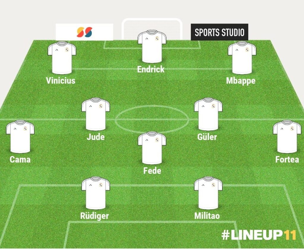 Este podría ser el once que utilizaría Arbeloa si se convirtiera en el técnico del primer equipo: Courtois; Jesús Fortea, Militao, Rüdiger, Camavinga; Valverde, Güler, Bellingham; Mbappé, Endrick y Vinicius.