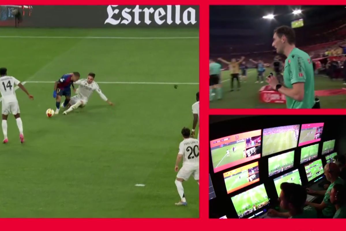 Asencio aguantó el regate de Raphinha y el brasileño, de manera muy descarada, se tiró dentro del área. Bengoetxea pitó penalti, a un palmo de la acción, pero rápidamente se llevó la mano al pinganillo por las indicaciones de González Fuertes desde la sala VOR.