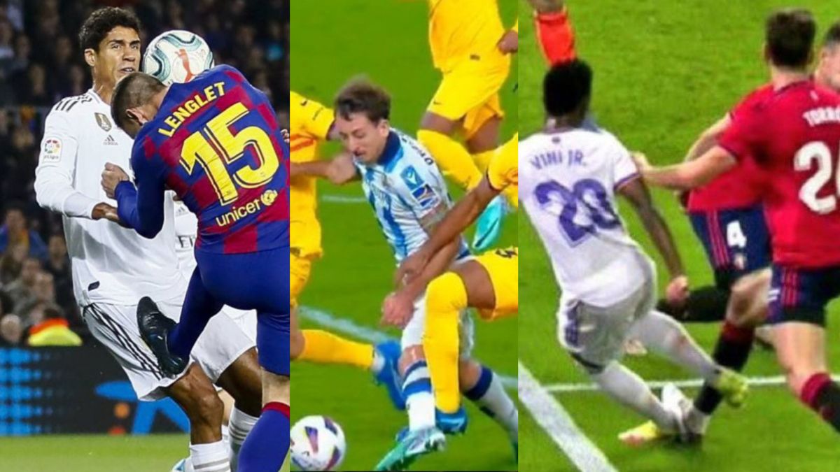 En un Real Sociedad-FC Barcelona en Anoeta, Koundé le dio una clara patada a Oyarzabal dentro del área, y el colegiado no señaló nada ni fue avisado por el VAR. Incluso el colegiado llegó a decir que fue Oyarzabal quien buscó el contacto con el pie de Koundé cuando se ve claramente en las imágenes que Oyarzabal tiene perfectamente ganada la posición y es Koundé quien golpea al delantero de la Real.