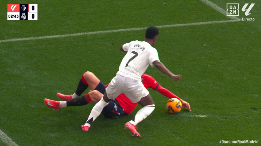 Moncayola arrolla a Vini Jr. sobre la línea del área, pero ni Munuera Montero ni Trujillo Suárez consideraron como penalti esa acción. La acción es exacta a la que sí le señalaron en el Manchester City-Real Madrid a Ceballos.