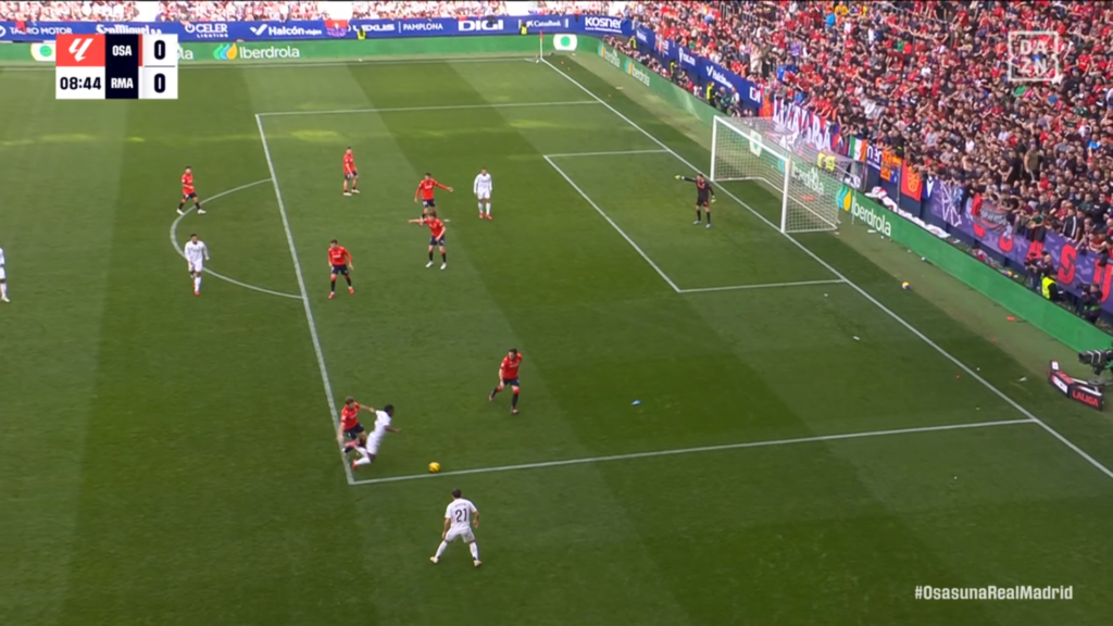 Carlo Ancelotti vio la tarjeta amarilla por pedir penalti en esta acción de Juan Cruz en el área de Osasuna#LALIGAenDAZN pic.twitter.com/ill67GzGyT