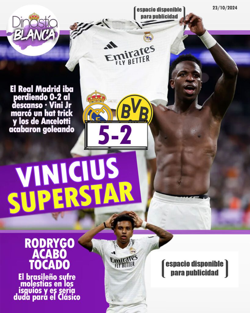 En Dinastía Blanca nos decantamos por un «Vinicius Superstar», contundente, para resumir el recital del crack brasileño, el mejor futbolista del planeta tierra. En sintonía con las portadas de los medios españoles de Marca y As. «Vinicius es de oro» y «remontada brutal» son los titulares elegidos.