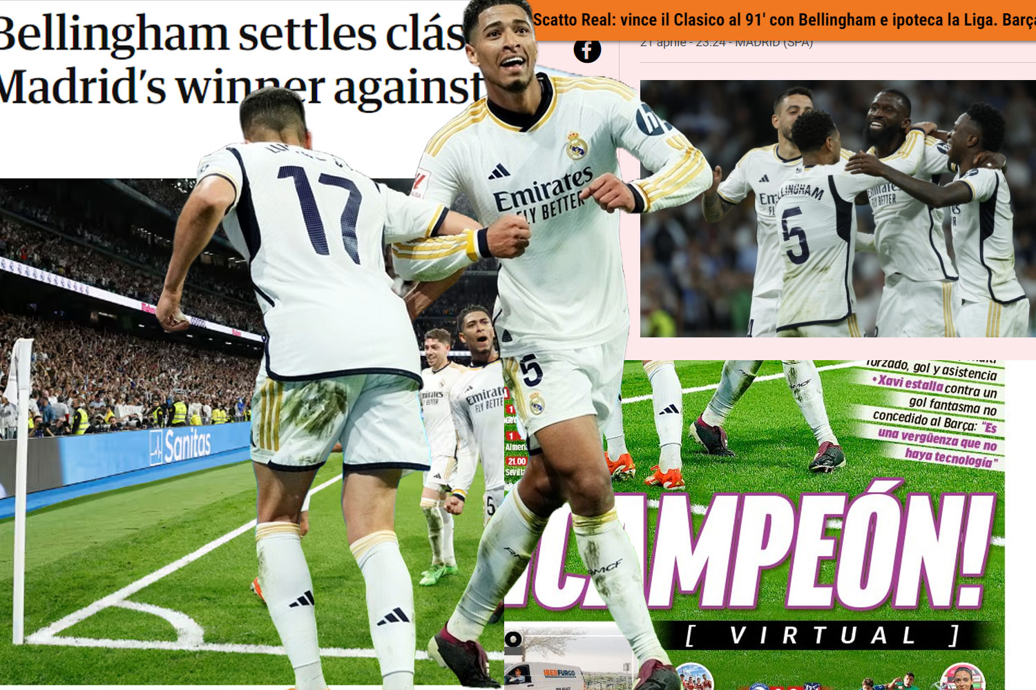La prensa de Inglaterra coincide en dar portada a Bellingham: «Bellingham resuelve el clásico con el triunfo del Real Madrid ante el Barcelona», titular en The Guardian. En Italia optan por hablar de esa carrera que queda por el título: «Sprint real: gana el clásico en el minuto 91 con Bellingham y asegura la liga. El Barça, enorme decepción», dice La Gazzetta.