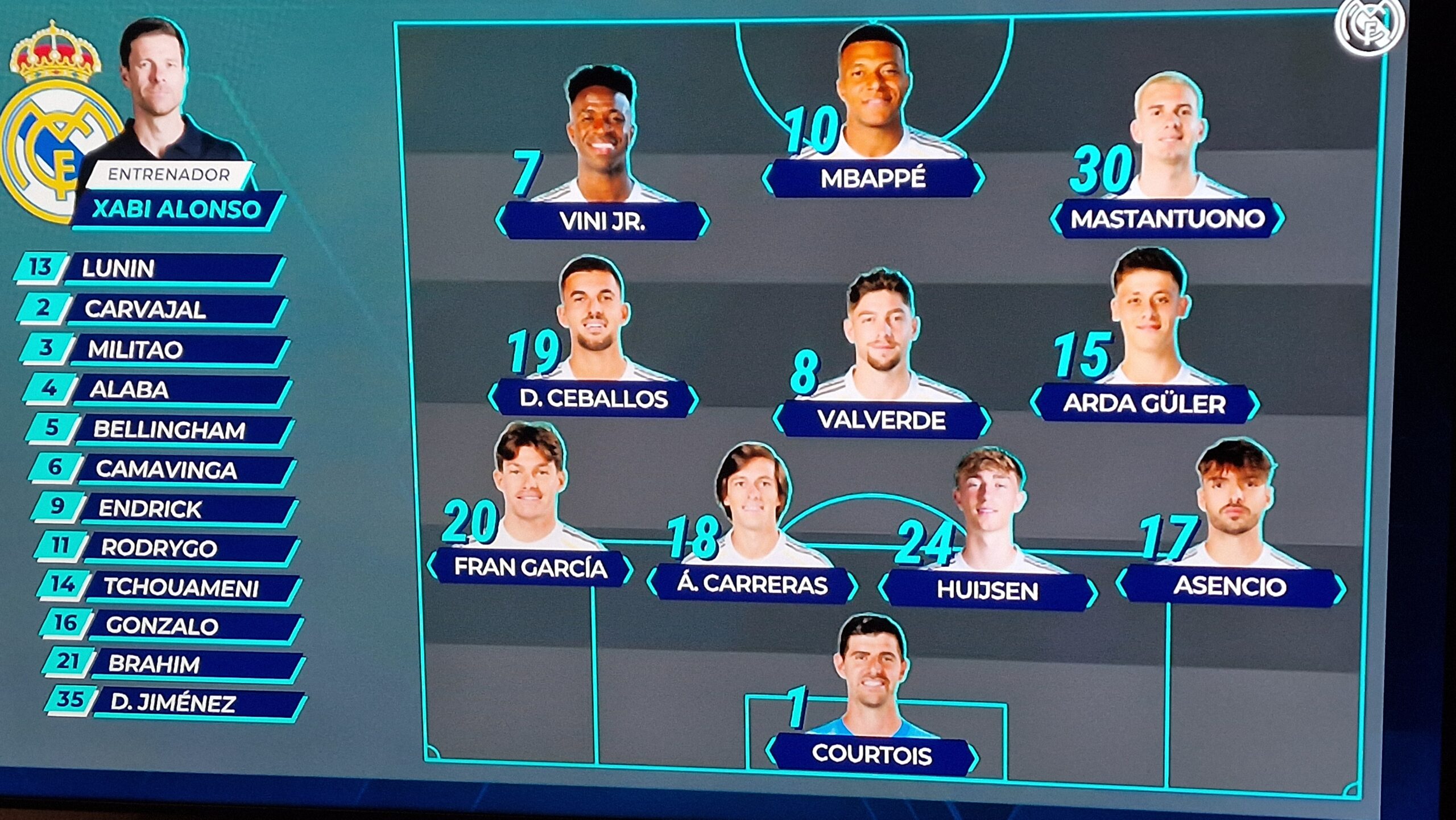 Courtois, Asencio, Huijsen, Carreras, Fran García, Valverde, Arda Güler, Ceballos, Mastantuono, Vinicius y Mbappé.