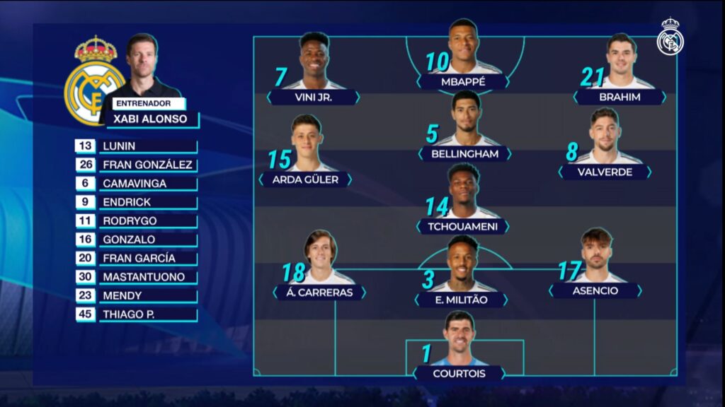 Xabi Alonso sale con Courtois, Valverde, Asencio, Militao, Carreras, Tchouaméni, Bellingham, Arda Güler, Brahim, Vinicius y Mbappé.