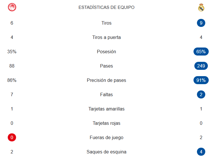 Las estadísticas del Olympiacos-Real Madrid (primera parte)