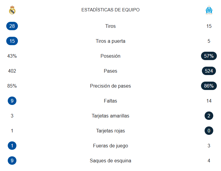 El Real Madrid debutó en la Fase Liga de la Champions frente al Marsella en el Santiago Bernabéu. Un partido trepidante que dejó estas estadísticas: