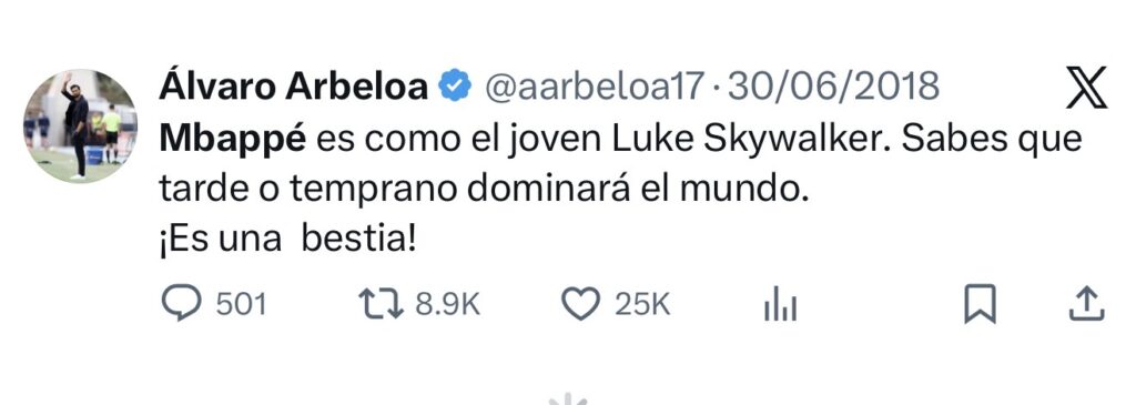 Siete años después, aquel tuit se ha convertido en realidad. Arbeloa deja de ser un espectador de las exhibiciones de Mbappé para convertirse en su entrenador en el Real Madrid. El «Espartano» asume el mando del equipo de las 15 Copas de Europa con el privilegio de dirigir al jugador que, tal y como él predijo, terminó dominando el panorama futbolístico mundial.