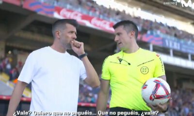 Las cámaras de Movistar cazaron a Díaz de Mera, el árbitro del Barça-Valladolid que acabó 7-0 diciéndole a Pezzolano que no hicieran faltas. Siguen los escándalos...