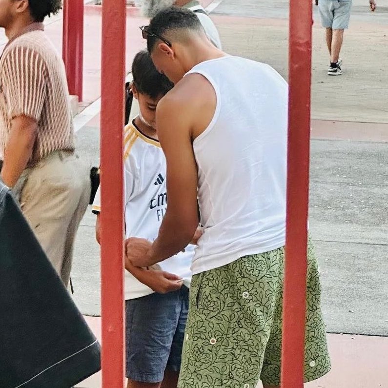 Alexander-Arnold suena como posible fichaje para la temporada 2025 y, siempre que puede, hace un guiño al club blanco. El último de estos gestos ocurrió ayer, cuando firmó una camiseta del Real Madrid a un aficionado madridista. Se le pudo ver de vacaciones con Bellingham o Tchouaméni en Ibiza.