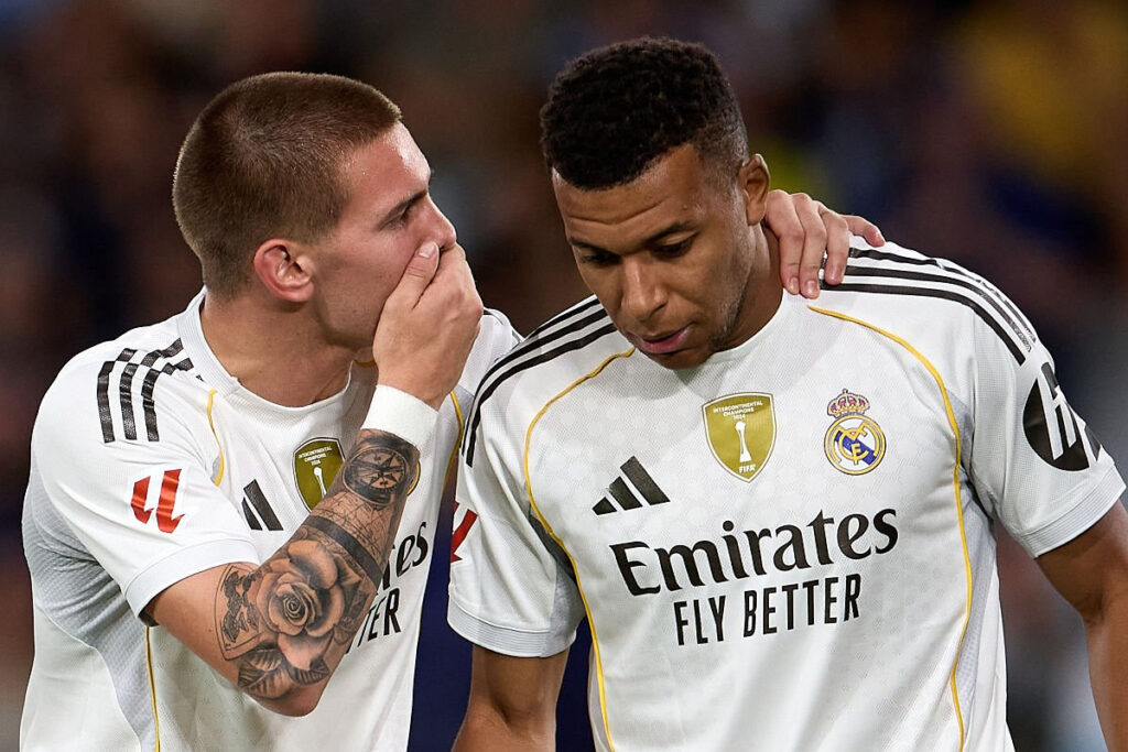 VALENCIA, SPAIN – SEPTEMBER 23: Franco Mastantuono speaks with Kylian Mbappe of Real Madrid during the LaLiga EA Sports match between Levante UD and Real Madrid CF at Ciutat de Valencia on September 23, 2025 in Valencia, Spain. (Omar Arnau/Photo by Quality Sport Images/Getty Images)