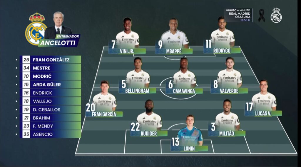14:00 horas, el Bernabéu lleno y una malísima racha de resultados en casa en la que se han llegado a encajar 9 goles en los últimos tres partidos. El Real Madrid buscó la reacción frente a Osasuna y Ancelotti, que dice tenerla, apostó por un once inicial conformado por los siguientes jugadores: