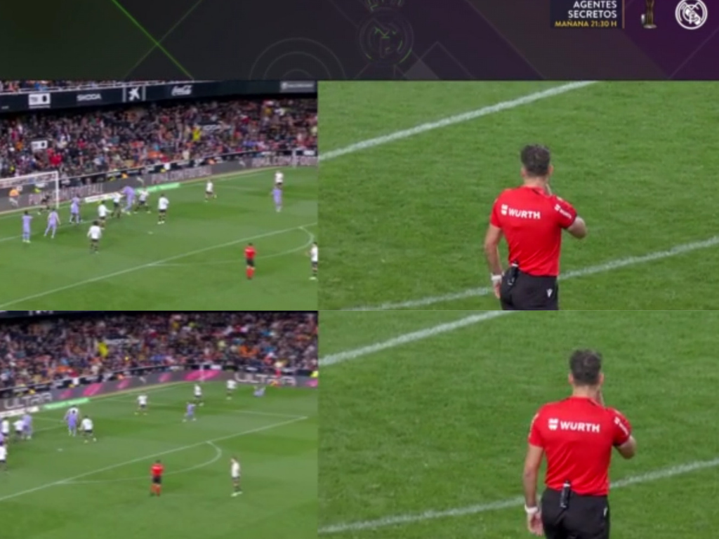 El córner se lanzó, el guardameta del Valencia despejó el balón, Gil Manzano dejó continuar la jugada, el rechace le llegó a Brahim, que centró al área, Bellingham remató de cabeza, y cuando Gil Manzano vio que el balón entraba, señaló el final ante la indignación de los jugadores del Real Madrid, que no entendían nada de lo que estaba pasando.