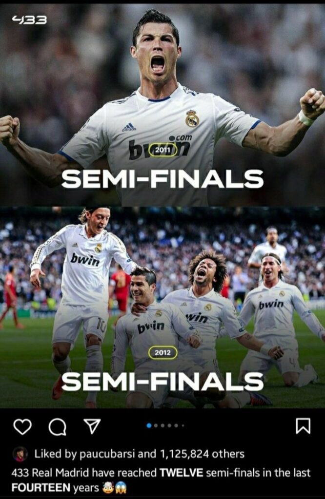 Un post de la cuenta 433 resaltaba el logro conseguido por el Real Madrid en Manchester ante el City. En el mismo mensaje se aprecia la gesta de conseguir estar en 12 semifinales en los últimos 14 años.