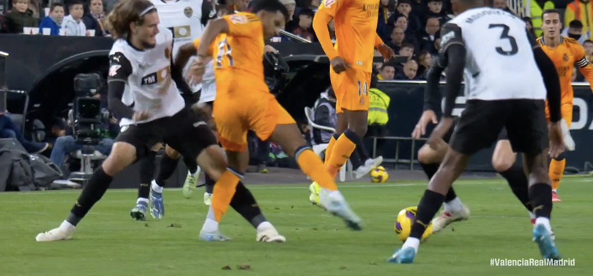 El Valencia encontró el primer gol del 2025 en Mestalla y lo hizo tras una falta sobre Rodrygo que no se pitó y que desquició al Real Madrid.