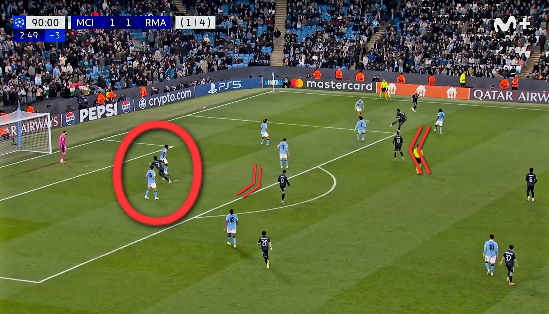 El Manchester City empezó atacando en tromba al Real Madrid, buscando remontar el 3-0 del Bernabéu, y en el minuto 19 de partido hubo una acción...