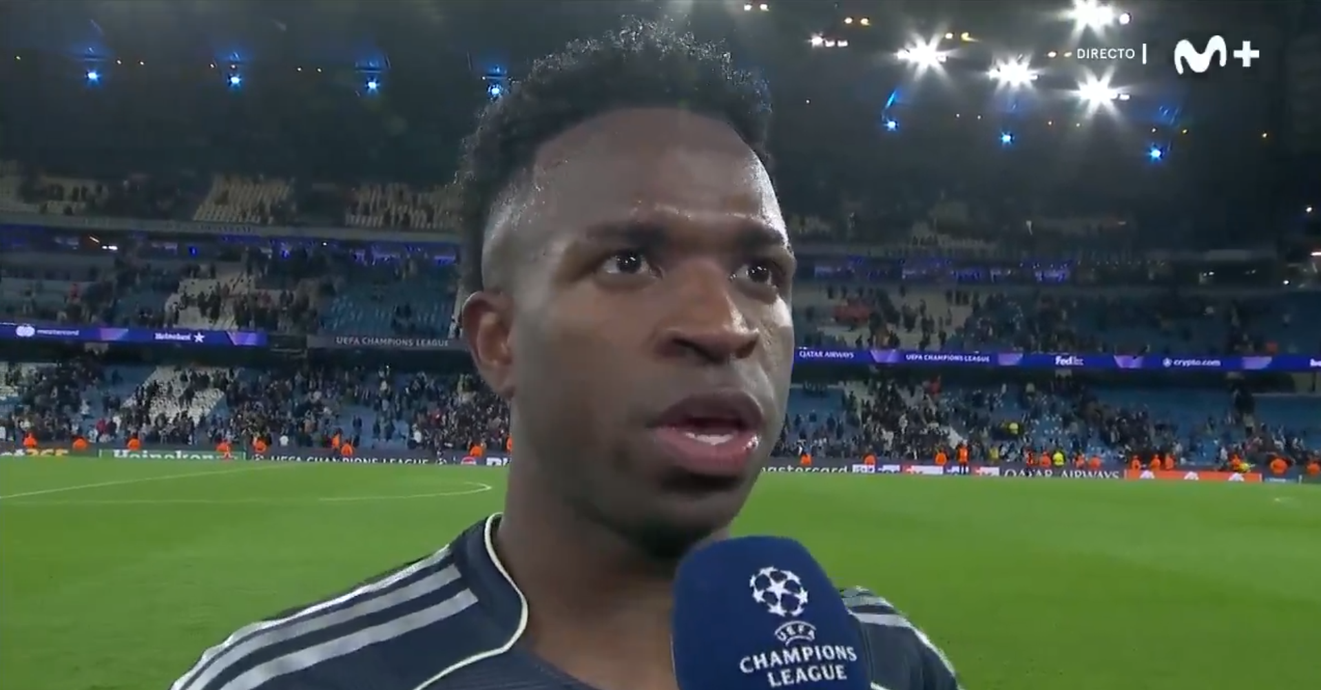Vinicius Jr. ganó el MVP en el Etihad Stadium marcando un doblete frente al Manchester City. El brasileño atendió a Movistar, a pie de campo, para...