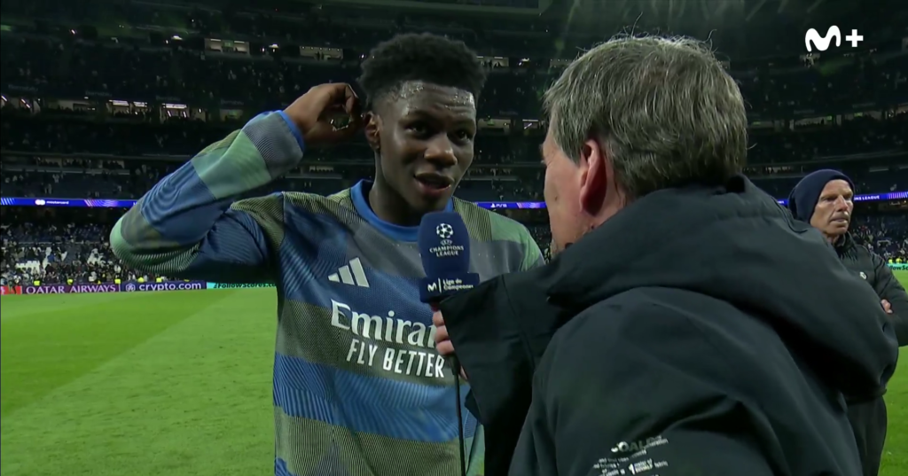 Aurélien Tchouaméni fue el encargado de atender a Movistar, a pie de campo, tras el Real Madrid-Mónaco en el Bernabéu.