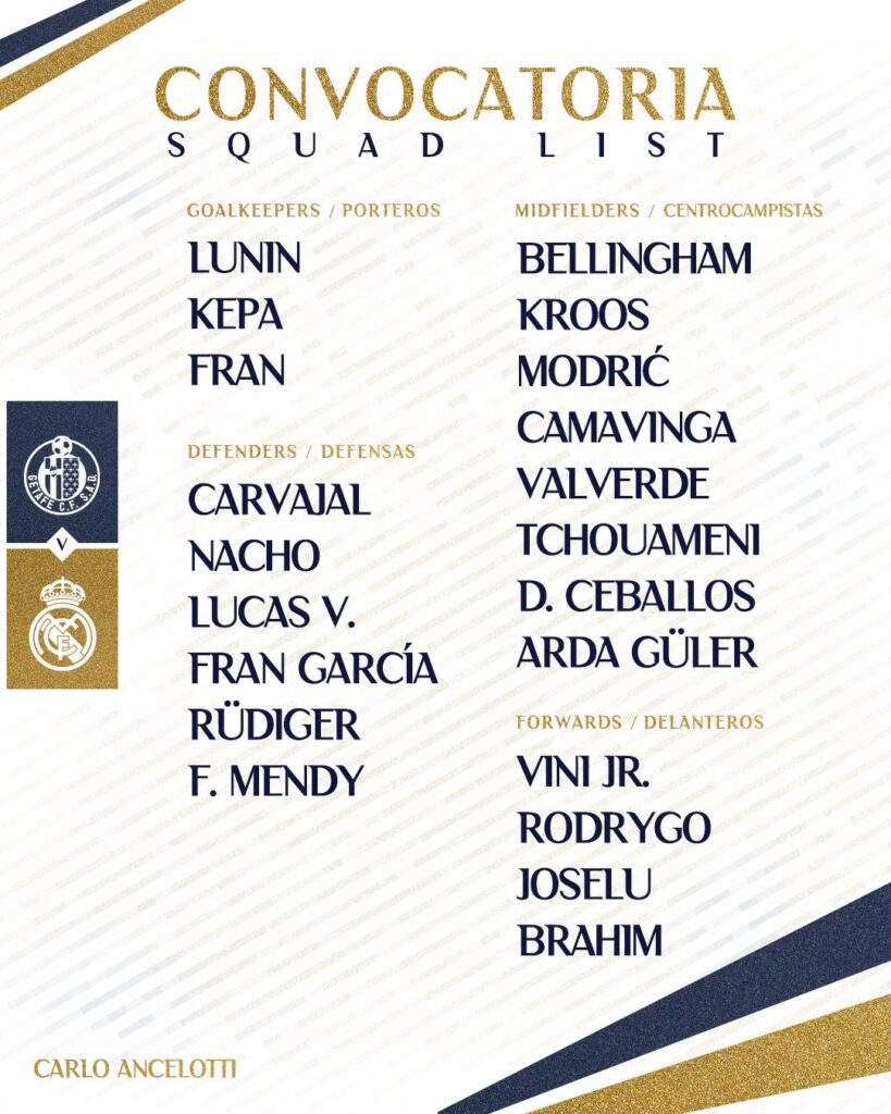 Para el partido de mañana ante el Getafe, Ancelotti recupera a Jude Bellingham, quien se perdió el último partido de liga ante Las Palmas por sanción al cumplir ciclo de tarjetas.