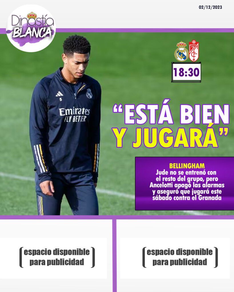 Carletto no pudo contar con Jude Bellingham en la sesión de entrenamiento. El inglés hizo trabajo en solitario tras sumar 90 minutos contra el Cádiz y contra el Napoli, en los que en ambos partidos marcó. Pese a ello, entra en la lista de convocados frente al cuadro andaluz, tal y como confirmó Ancelotti. Al igual que Kepa Arrizabalaga.